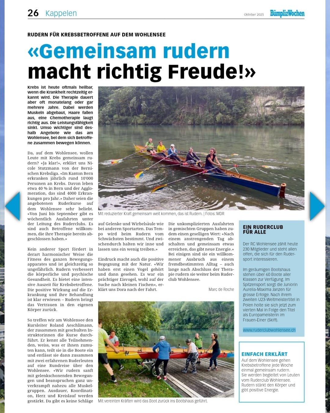 In der Oktober Ausgabe der BümplizWochen wird über das Rudern Angebot der Ruderclub Wohlensee in Kooperation mit der Krebsliga Bern berichtet, das jedes Jahr im Sommer stattfindet. Das Rudern bietet Krebsbetroffenen eine Auszeit und fördert Körper, Geist und Gemeinschaft.